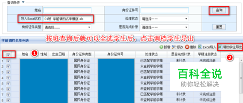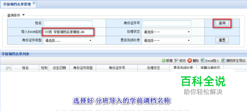 点开【学前调档信息管理】后,选择好导入Excel名称后,点击【查询】。