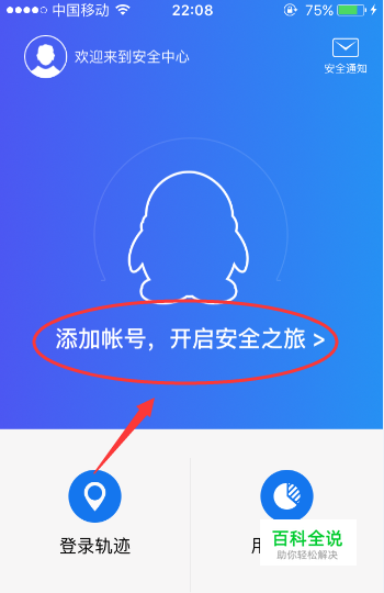 如果QQ安全中心没有添加任何的QQ帐号,进入主页面后我们会看到页面中间处会显示“添加帐号”等字样,我们点击它。