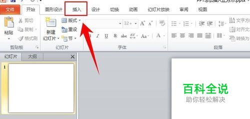新建并打开一个PPT,并新建一张幻灯片,然后在PPT的菜单栏中点击【插入】选项。