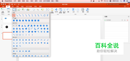 首先还是打开PPT,新建文档,版式空白,小球摆动首先需要画出来小球和线段,选择插入线条