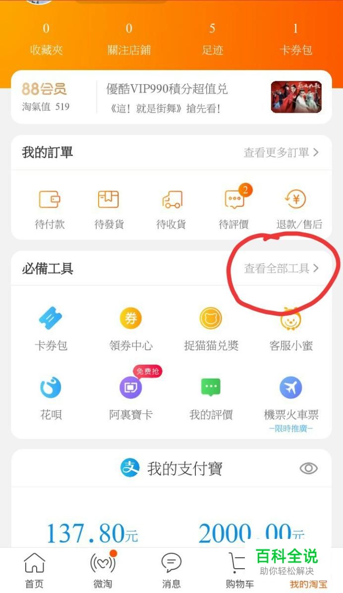 打开并登录淘宝app,找到“我的淘宝”→点击“查看全部工具”,出现以下画面