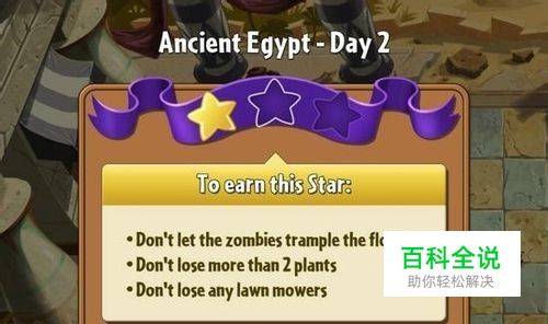 二星达成目标: 不要让僵尸践踏到花朵(游戏中间有一条花朵模样的线,不让要僵尸超过这条线,建议用坚果墙阻挡) 失去的植物不要超过2个(不要用那个消费为0的寒冰植物,它会算入损失的植物中) 不要失去草坪剪草机