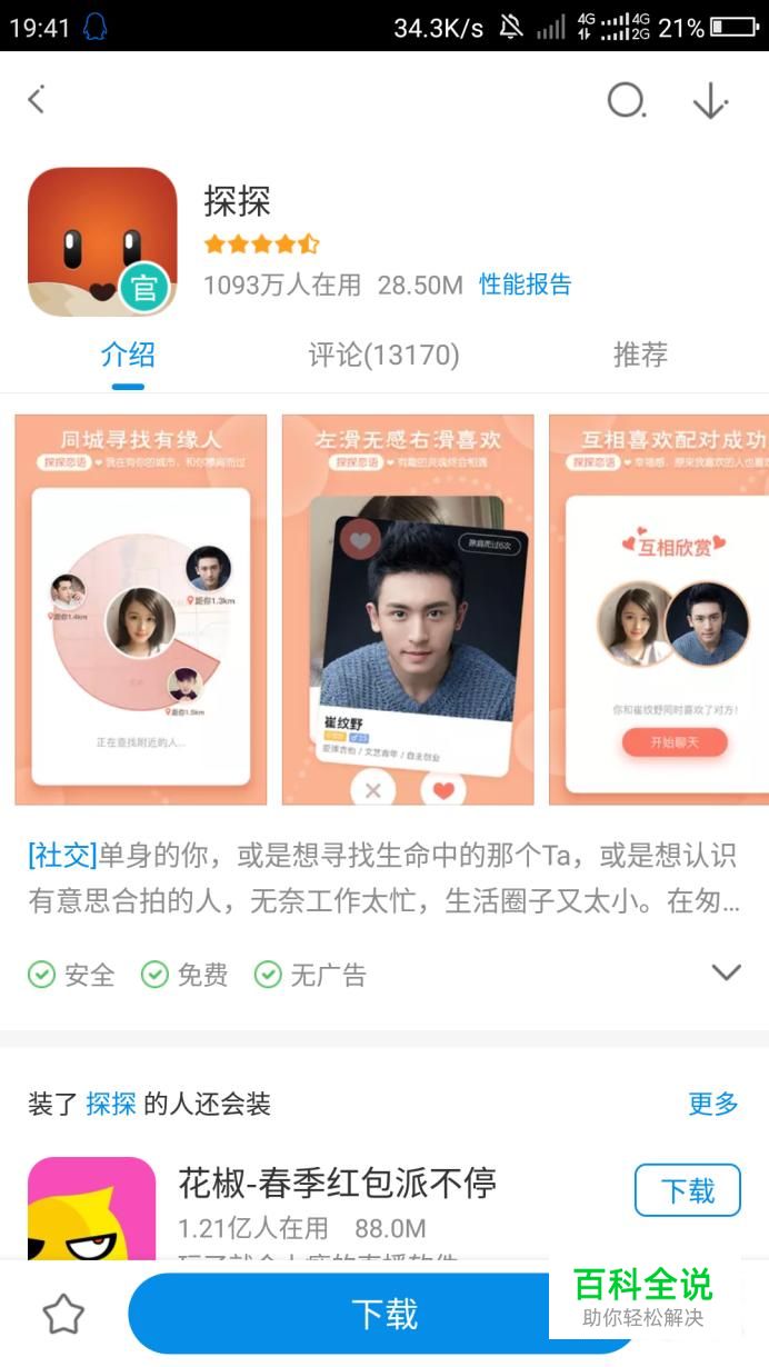 探探是一款基于地理位置的交友软件,使用者可以在探探上通过左右滑动认识附近的人,左滑再见,右滑喜欢。