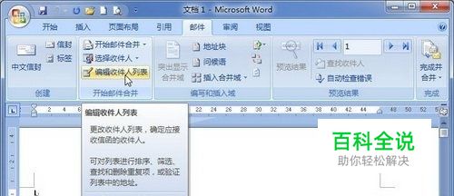 第1步,打开Word2007文档窗口,切换到“邮件”功能区。在“开始邮件合并”分组中单击“编辑收件人列表”按钮,如图2011102714所示。 图2011102714 单击“编辑收件人列表”按钮 小提示:如果“编辑收件人列表”按钮不可用,则需要在“开始邮件合并”分组单击“选择收件人”按钮,并选择合适的收件人列表(参考教程《在Word2007文档中编辑收件人列表》)。