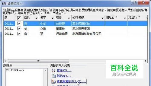 第2步,打开“邮件合并收件人”对话框,在“调整收件人列表”区域单击“查找重复收件人”超链接,如图2011102715所示。 图2011102715 单击“查找重复收件人”超链接