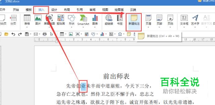 选中需要添加批注的内容,点击“插入”选项卡中的“新建批注”。