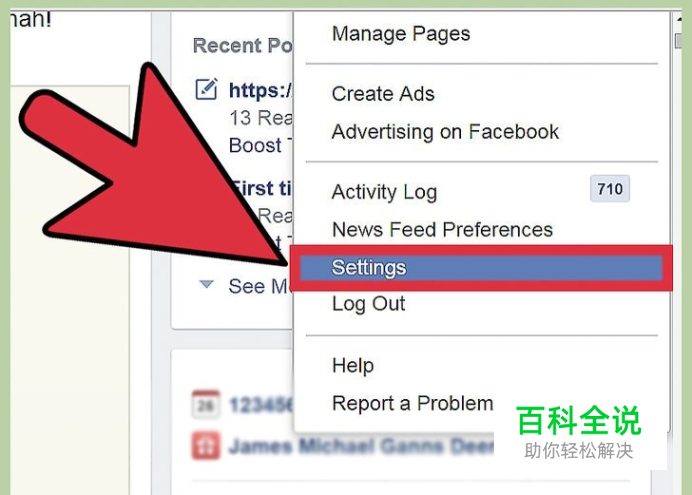 点击设置键。设置键位于脸书网页面右上角处,其图标是个齿轮。在菜单中选择“账户设置”。
