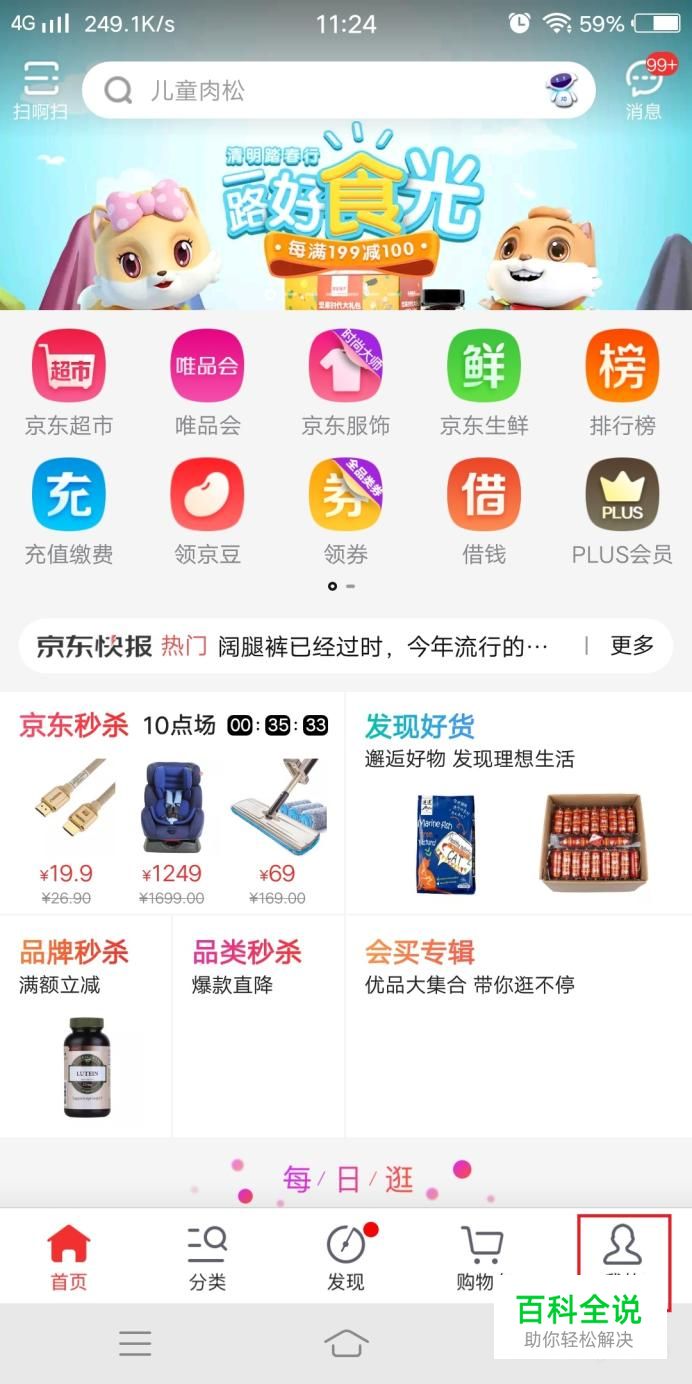 打开手机京东APP,点击右下角“我的”功能键,如图所示