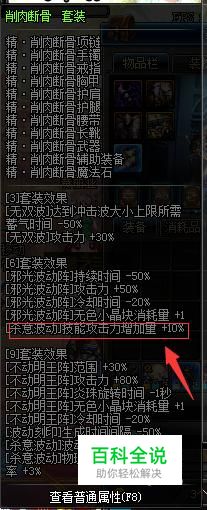 异界套削肉断骨套装,杀意波动的伤害增加10%,这是必备的。建议选择鞋子,腰带,手镯,项链,辅助装备,魔法石这六件。