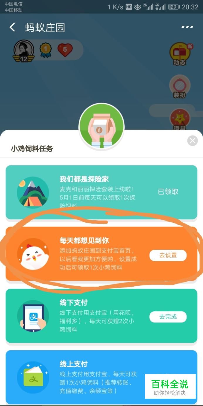 你可以把蚂蚁庄园添加到你的支付宝首页,这样可以也免费获得一次领饲料的机会,还可以更方便照顾你的小鸡