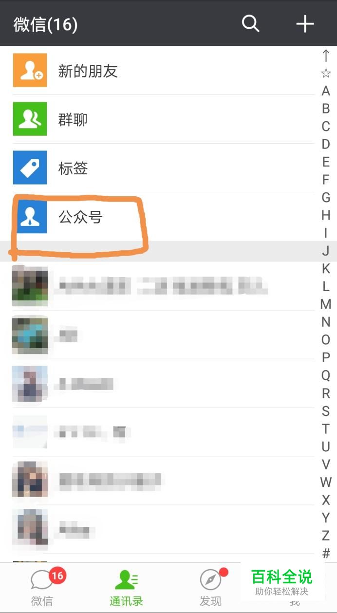 首先点击底部菜单栏的联系人,点击进去后有一栏公众号按钮,点击进入。