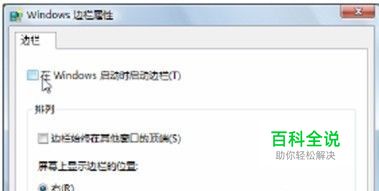 使用上而的方法关闭边栏后,下次运行win7旗舰版仍然会启动边栏。如果要彻底关闭边栏,可在快 捷菜单中选择“属性”命令,在弹出的对话框中取消 勾选“在Windows启动时启动边栏”复选框,然后单 击“确记”按钮保存设罝即可。