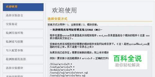 安装杰奇小说 如果之前没有安装JIEQI CMS,需要进行“全新安装”来一步步安装软件;如果有安装过JIEQI CMS,现在只需要安装某一个模块,我们就只需要选择“模块安装”来安装程序。例如:需要安装论坛程序,只需要勾选“forum”就可以了。 下面按照【全新安装】来操作,【豪门小说站】 首先访问 http://www.domain.com/install/index.php 进行安装; (www.domain.com 是指你自己网站域名)【豪门小说】