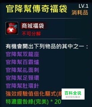 官降幫傳奇福袋 消耗品 商城福袋 有機會開除下列物品的其中之一: 官降幫雙龍座 官降幫百爐霸 官降幫乩面刺 官降幫足頸環 官降幫肚環針 強效經驗值倍化驅式(綁)*1 特濃靈咎綠(完美)*20 中級品質恢復藥水*20