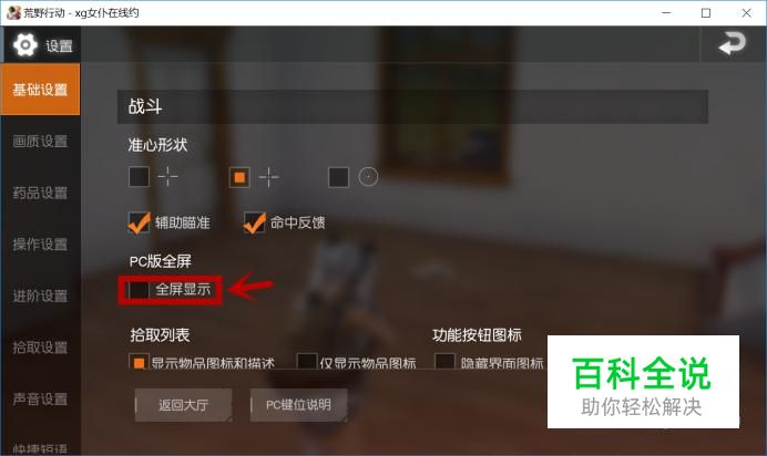还有可能就是鼠标拖动幅度过大鼠标拖到了荒野行动窗口的外面,这种情况可以按【esc】键打开设置然后勾选全屏模式。