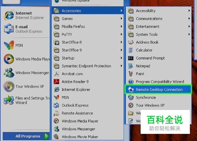 如果你使用的是Windows XP或Windows Server 2003系统,那么你可以在“开始”菜单中依次点击“所有程序”→“附件”→“通讯”,找到“远程桌面连接”菜单项。