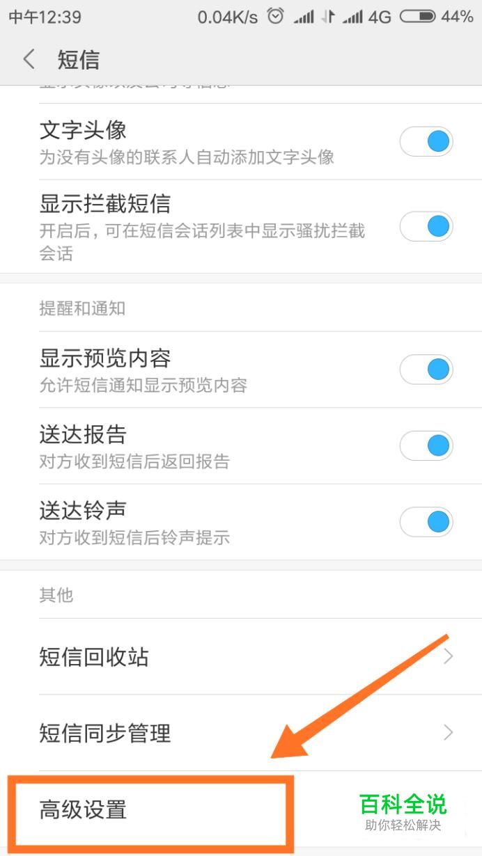 进入高级设置之后,也会出现一个菜单页面,在下方找到设置短信中心号码。