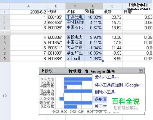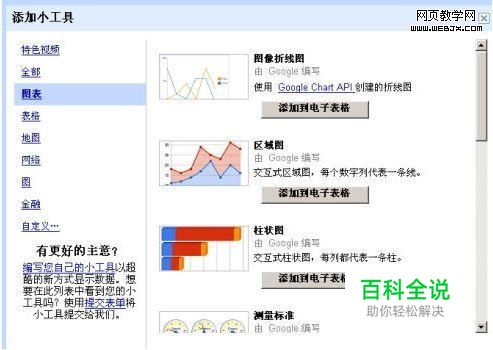 第三步:在Google文档的编辑窗口中选中相关单元格,点击屏幕右上角的“插入小工具”按钮,在“添加小工具”对话框中选择自己需要的工具类型,我们要选择的自然是“图表”类中的相关图表,如我选择的就是经典的“柱状图”,点击其下的“添加到电子表格”按钮。