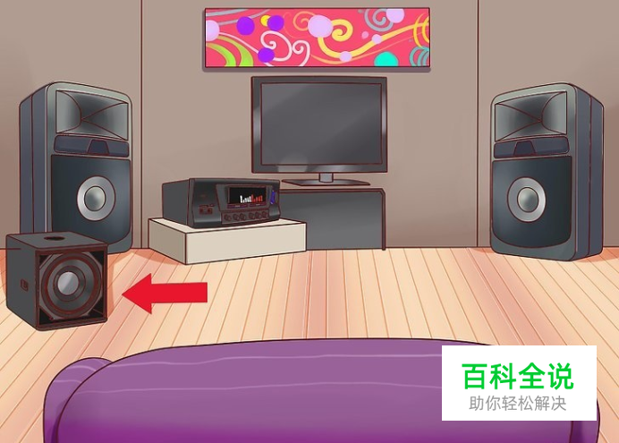 放置低音炮。低音炮的声音是全方位的,这意味着不论低音炮放置哪里,你都可以得到类似的效果。许多人喜欢把它放到最前面,以便容易连接接收器。