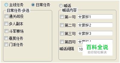 【自动主线任务】 顺着天珠变游戏的主线任务走,主线任务和支线任务可以得到大量的经验、储金和修为,有些任务会赠送装备。 【自动日常任务】 通关战役、多人副本、斗军赛场、悬赏任务、门派任务等。 【自动喊话】 自定义喊话内容、喊话间隔时间。
