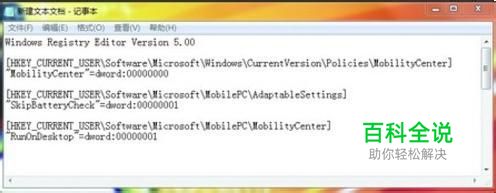 第二步:导入注册表文件 打开记事本,接着输入以下内容(如图2): Windows Registry Editor Version 5.00 [HKEY_CURRENT_USERSoftwareMicrosoftWindowsCurrentVersionPoliciesMobilityCenter] "MobilityCenter"=dword:00000000 [HKEY_CURRENT_USERSoftwareMicrosoftMobilePCAdaptableSettings] "SkipBatteryCheck"=dword:00000001 [HKEY_CURRENT_USERSoftwareMicrosoftMobilePCMobilityCenter] "RunOnDesktop"=dword:00000001 上述内容输入完毕后,将这个记事本文件另存为扩展名为REG格式的注册表文件(如“A.REG”)并将其导入到注册表编辑器中即可。