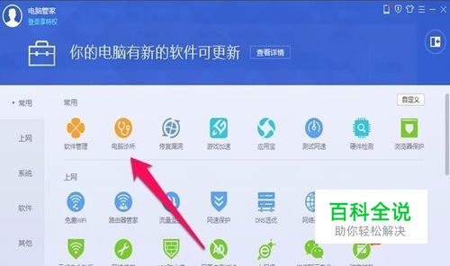 打开“电脑管家”,右下角“工具”,找到“电脑诊所”