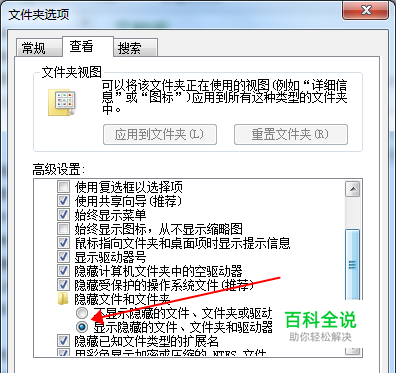 选择文件夹选项--》查看,下拉修改显示隐藏文件夹选项。
