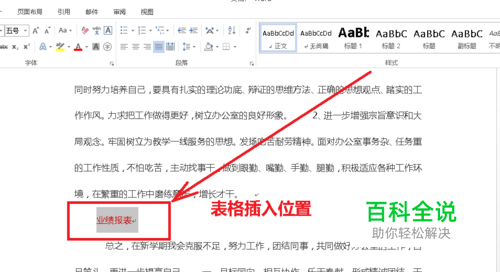 我们先定位到需要插入横向表格的位置,如下图的业绩报表一行上,选“业绩报表”这一行。