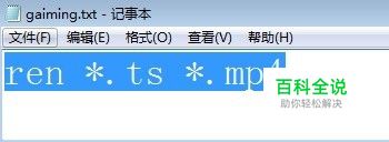 然后 在文件夹中新建txt文档,输入如图所示内容 也就是:ren *.ts *.mp4 ren空格*.ts空格*.MP4 将TXT后缀改为.bat 批处理
