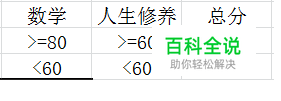 高级筛选功能:适用于条件较多时筛选数据时使用,此功能可有效避免频繁选择筛选条件的烦琐工作。在表格空白处建立条件:同一行的为“且”关系,即要求该行的所有条件同时满足;不同行为“或”关系,即任意一行符合即可。但条件区域首行必须为字段名。如:以下条件筛选的为:数学成绩>=80分且人生修养成绩>=80分且总分>=400分的数据或数学成绩<60分且人生修养成绩<60分且总分<300分的数据