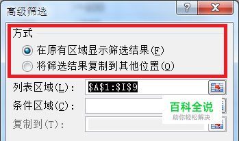 在“方式”中选择筛选后的数据显示位置:“在原有区域显示筛选结果”即同普通筛选一样在原位置显示筛选结果并自动隐藏不符合条件的数据;“将筛选结果复制到其他位置”即将筛选的符合条件的数据放到用户自定义的位置,若选择此项,则应注意新定义的位置必须足够大以容纳所筛选的数据,数据存放位置在“复制到”选项中设定。
