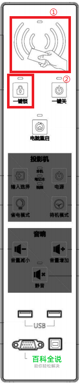 故障一:长按“一键关”后没有反应 可能原因:执行了“一键锁”而导致中控被锁 解决办法:将鸿合教育云ID卡放入读卡识别区内,解锁后再执行“一键关”
