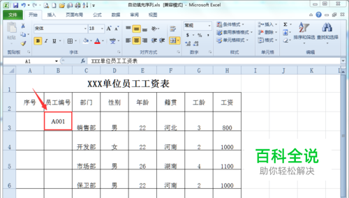 方法一:鼠标拖动法。选择起始单元格,并在此单元格中输入序列的开始数据。如在下面的B3单元格中输入“A001”。