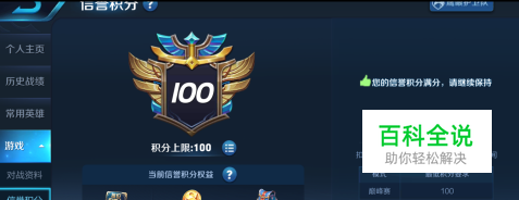 在这个页面我们马上就能知道我们的信誉分是多少。信誉分太低的话,排位等是玩不了的哦~