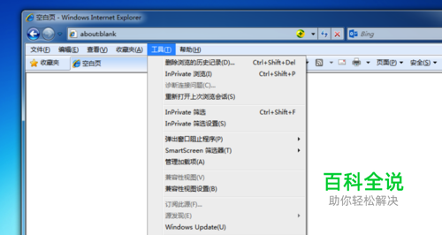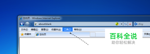 如下图所示,先请打开电脑上的 IE 浏览器,然后点击窗口菜单栏中【工具】栏目,如图所示 注:如果 IE 上没有出现菜单栏,请先按下键盘上的 Alt 键即可出现。