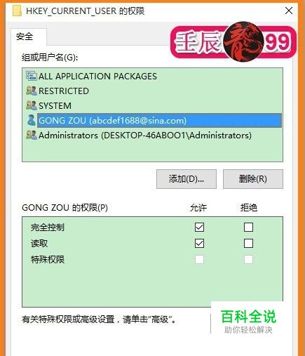 在HKEY_CURRENT_USER的权限项目窗口的高级权限下,点击:完全控制,再点击:确定;