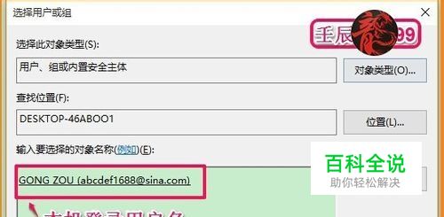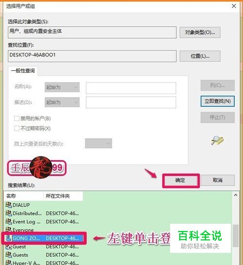 在搜索结果(U)栏中用鼠标按住右侧的小滑块向下拖动,找到本机登录的用户名如:GONG ZOU,并左键单击用户名,再点击:确定;