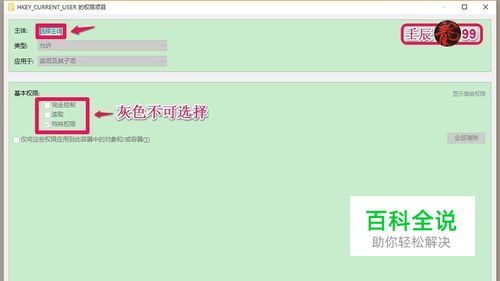我们在HKEY_CURRENT_USER的高级安全设置窗口,点击添加以后,就会打开 HKEY_CURRENT_USER的权限项目窗口,在这个窗口中,基本权限项都呈灰色状态不可选择,我们点击:选择主体;