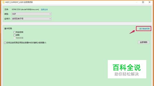 这时就会回到HKEY_CURRENT_USER的高级安全设置窗口,我们在这个窗口,点击:显示高级权限;