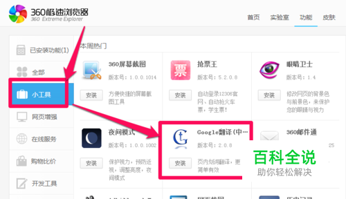 全部功能有点多,找到小工具点击,再找到Google翻译点击安装。