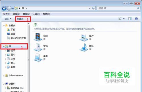 随便打开一个文件夹,在左侧找到“库”选中它后左上角会有个新建库或者在文件夹内容区”鼠标右键→新建→库“,如下图(里面的桌面是我已经建好的一个)