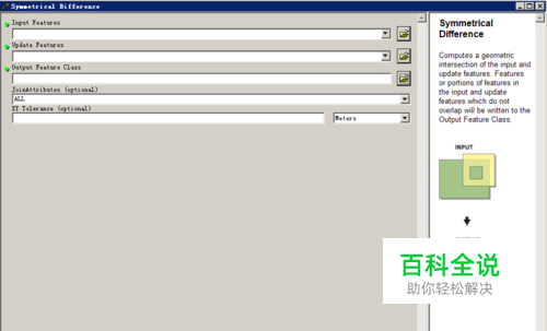 点击 Symmetrical Difference后,弹出如图所示界面 input features 为要去除重叠的数据面 update features 为重叠面 output features 为保存路径 设置完成后点击ok运行即可