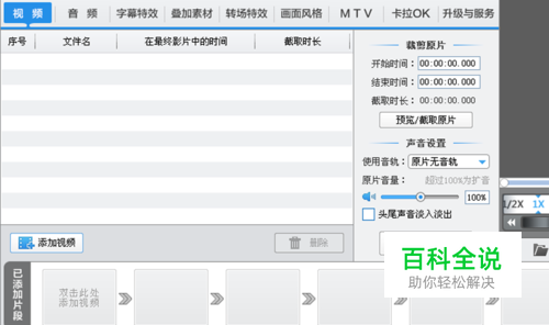 点击左下角的“添加视频”按钮,在弹出的请选择视频对话框中,选择需要处理的视频素材,将它们导入。