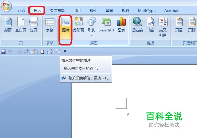 首先,我们打开一个空白的Word文档用来演示,点击“插入”,工具栏中点击“图片”按钮。