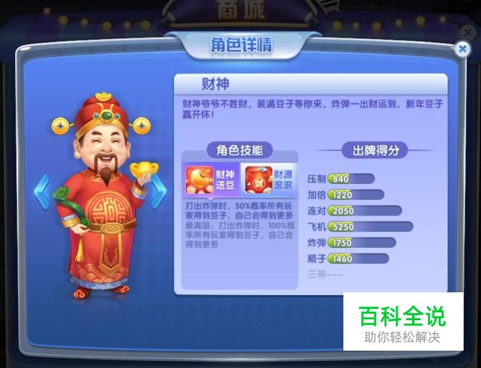 财神,当使用财神打出炸弹时会获得欢乐豆,出牌会获得更多得分,而且购买钻石的时候会额外获得更多钻石,土豪必备