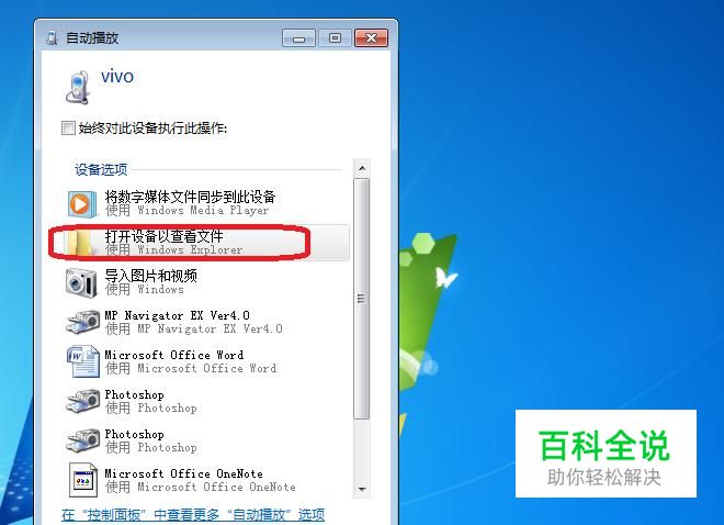 首先,用手机数据线连接电脑和手机,会出现如下图所示的提示框,我们选择“打开设备以查看文件”。