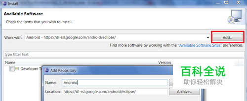 在work with这栏添加地址:https://dl-ssl.google.com/android/eclipse/