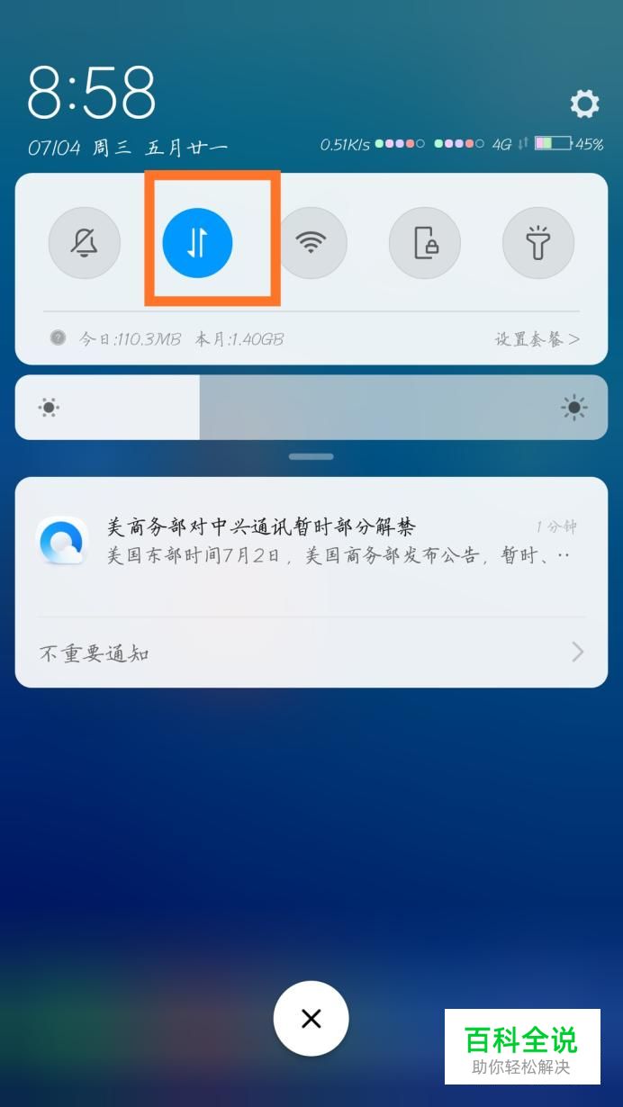 我们接下来就是设置移动流量的卡了,设置可以很好的避免一张卡的流量超出,首先拉下状态栏,找到数据流量的图标,然后长按。