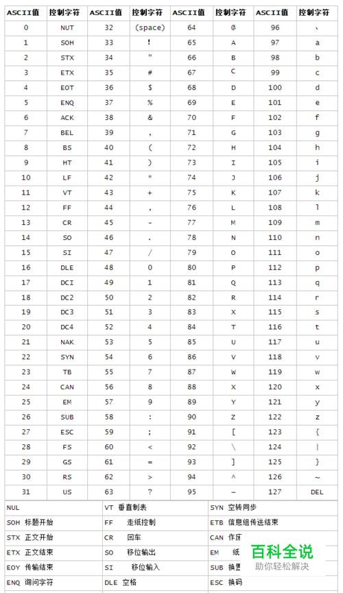0~31及127(共33个)是控制字符或通信专用字符(其余为可显示字符),如控制符:LF(换行)、CR(回车)、FF(换页)、DEL(删除)、BS(退格)、BEL(响铃)等;通信专用字符:SOH(文头)、EOT(文尾)、ACK(确认)等;ASCII值为8、9、10 和13 分别转换为退格、制表、换行和回车字符。它们并没有特定的图形显示,但会依不同的应用程序,而对文本显示有不同的影响。 32~126(共95个)是字符(32是空格),其中48~57为0到9十个阿拉伯数字 65~90为26个大写英文字母,97~122号为26个小写英文字母,其余为一些标点符号、运算符号等。