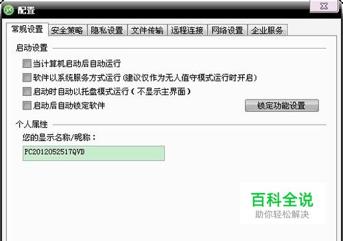 首先我们看看常规设置,在这里我们可以修改启动设置和显示名称/昵称。 启动设置分别有开机自动启动、以系统服务方式运行(适用于被控电脑无人值守)、自动以托盘模式运行(运行软件后不会出现主界面,直接放到系统托盘处)和启动后自动锁定四个可选设置,还有一个锁定功能设置按钮。 其中值得说一下的是锁定功能设置,点击此按钮后会弹出锁定功能设置框,我们可以设置解锁密码,设置了解锁密码后,想要进入软件界面就要输入解锁密码才能进入,这项设置的作用就是禁止其他人进入或退出软件。